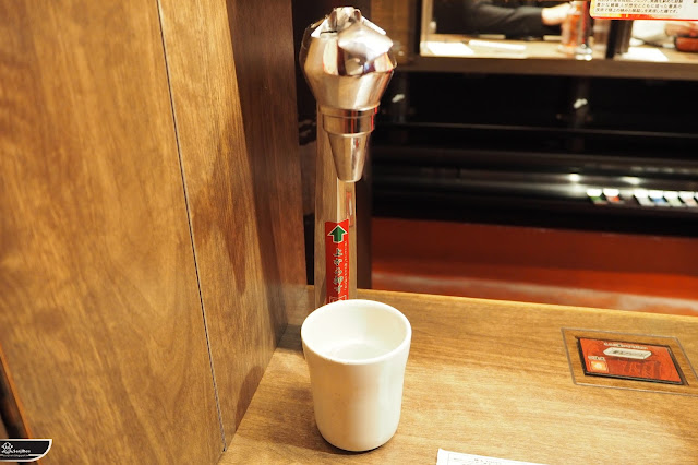 當然按照日本餐廳的慣例,都會奉上冰水。一蘭拉麵則為自助式的,每個座位左側皆有飲水機可供使用。