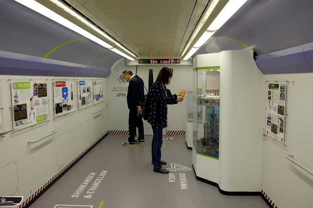 好啦~其實重點不在這裡,但也是頗有可看性。1號車廂其實也分成兩部分,前半段展示了新幹線和福音戰士的演進史,讓有興趣的乘客了解過去新幹線的40年和《新世紀福音戰士》的20年歛了多少財做了什麼事。