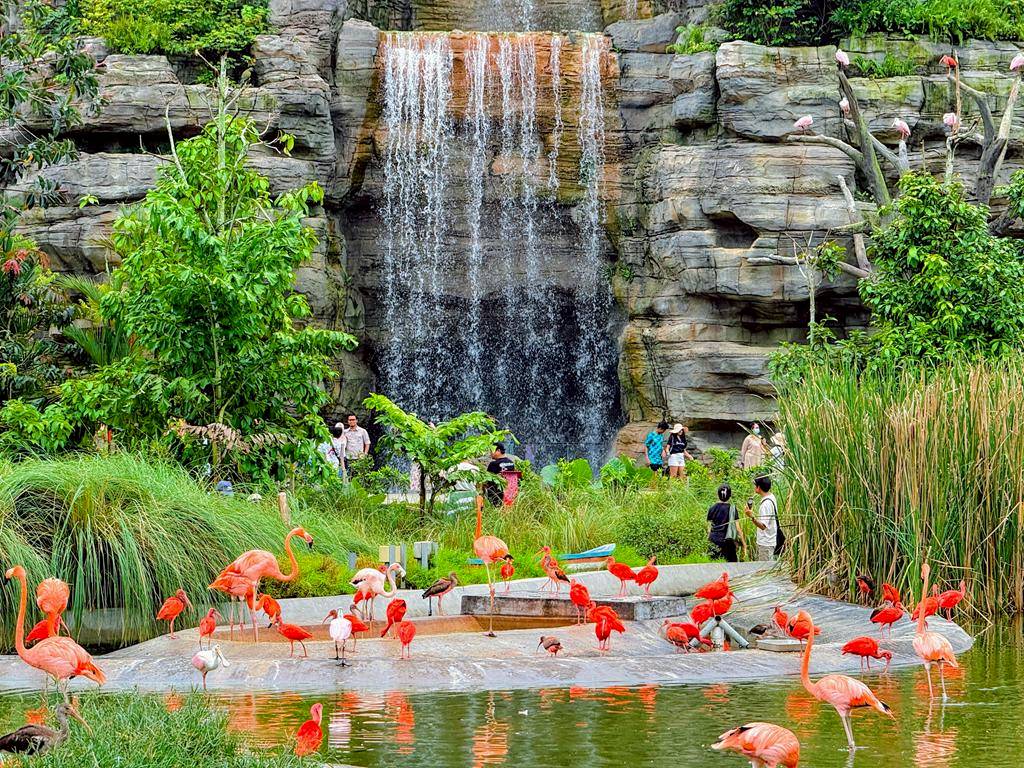 ●緋紅濕地(Crimson Wetlands): 這是園區內最繽紛的一區,模擬拉丁美洲沿海濕地,成群的美洲紅鶴與粉紅琵鷺在睡蓮與紅花間飛舞,畫面壯觀且色彩鮮豔。