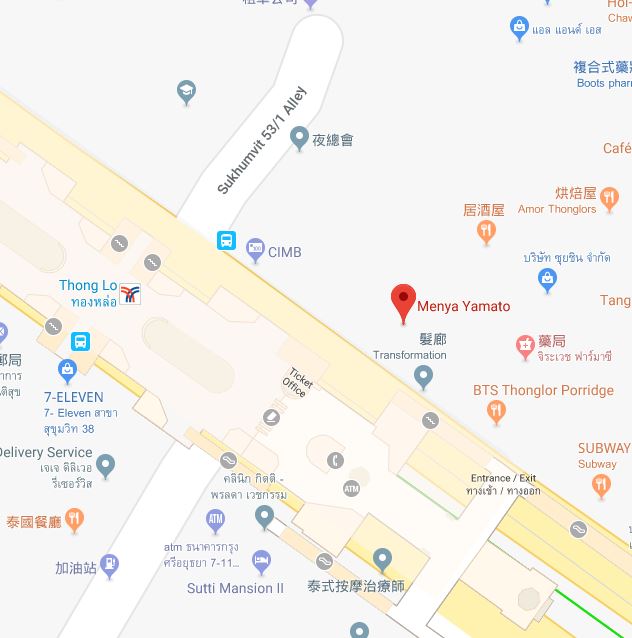 麺屋やまと Menya Yamato 這間無湯拉麵店位置非常便利,就在BTS Thong Lo站下面,從Thong lo站下來向53/1巷方向走,約一分鐘的腳程。店面乾淨明亮,店家的裝潢則走新派風格