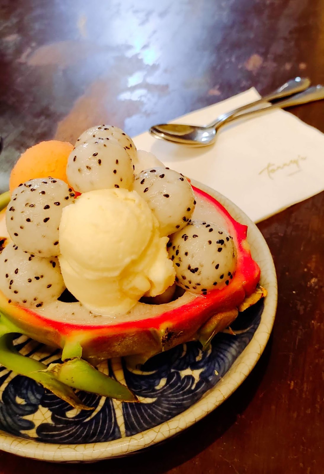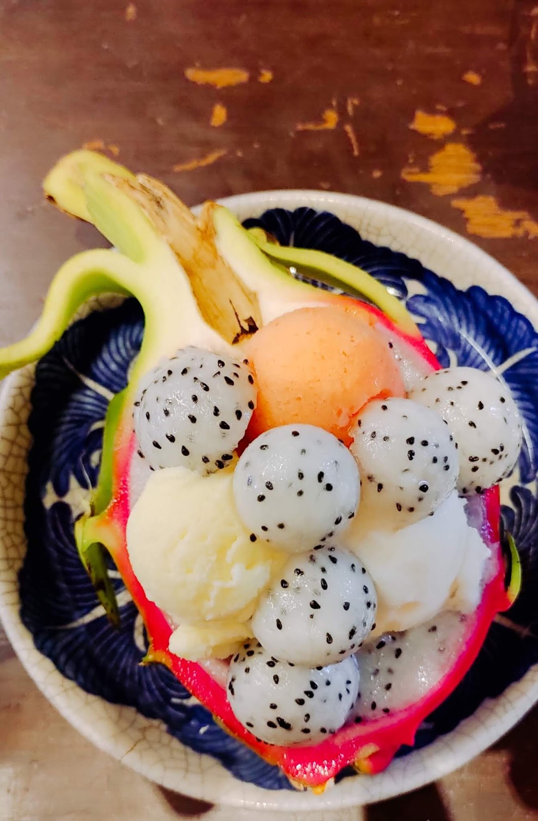 以火龍果作為器皿,裡面有布吉土產菠蘿、士多啤梨檸檬,跟荔枝玫瑰三種口味的雪葩,清新消暑。