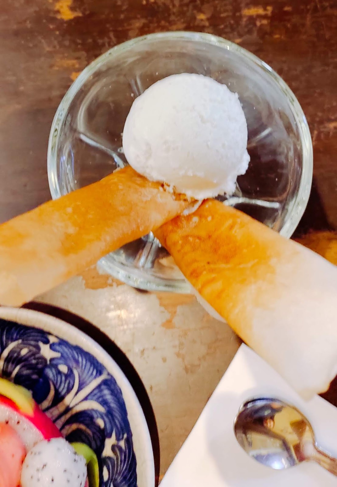店家招牌菜之一,A-Pong 其實是布吉街頭隨處可見的傳統甜點椰香脆餅 อาโป๊ง (廣東譯音: 阿綁),估計是從潮州或是福建傳入。脆餅內有椰絲,芝麻,口感像糖蔥餅,配雪糕吃必有一番風味。