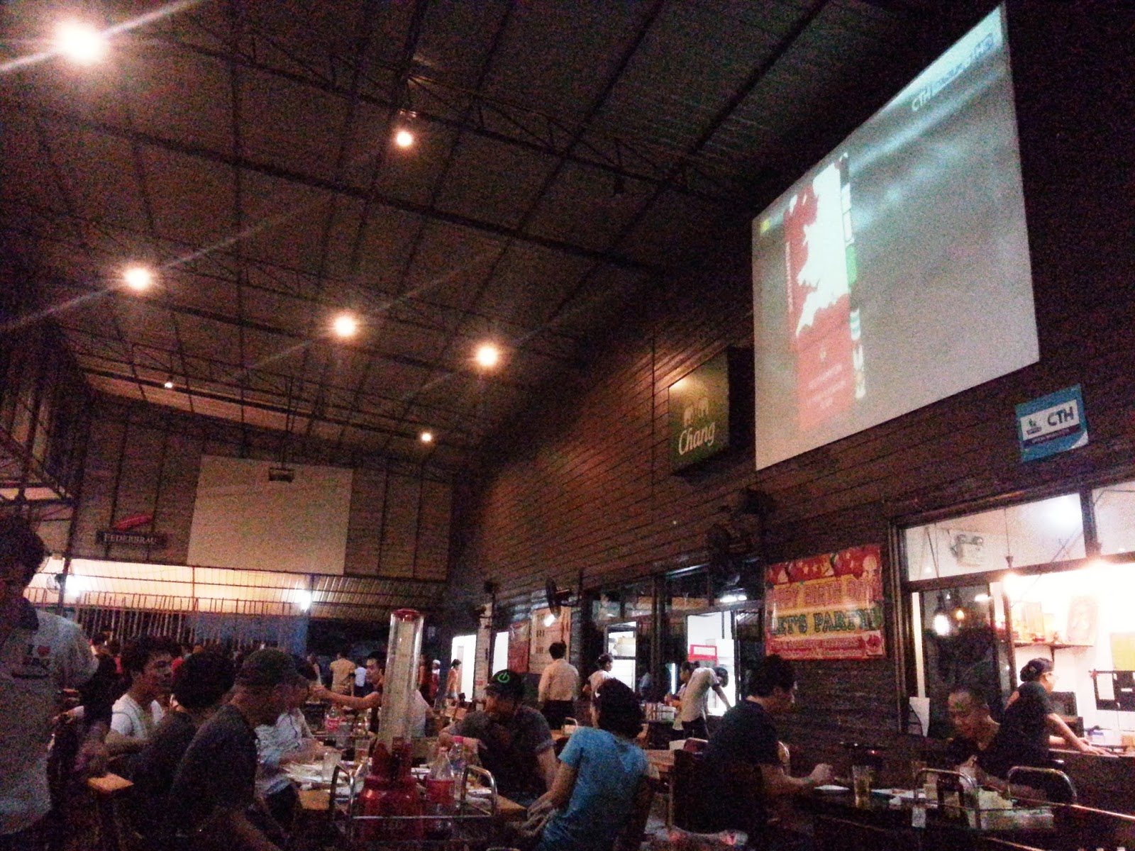 桌子放得密密麻麻的,泰國人就是愛這種熱鬧的感覺,三五知己吃燒烤再點個啤酒塔這樣。唱内設有巨型投影屏幕,每有足球賽事時氣氛更是高漲。(圖片來源:Best Beef Facebook)