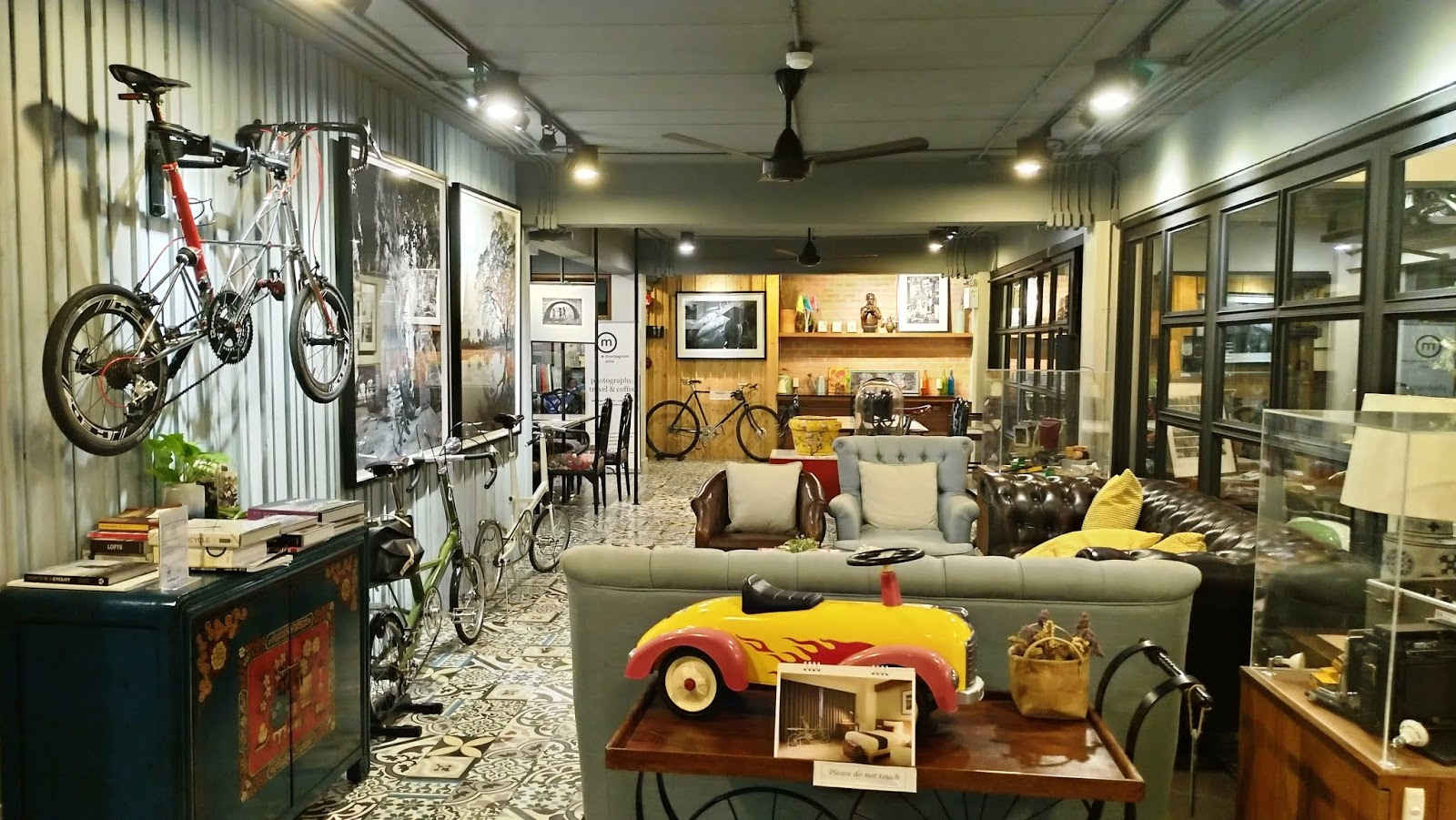 回到旅館的公共休憩空間,吊扇,古色沙發,單車,舊玩具等,看似風馬牛不相及的東西放在一起,卻是很有味道。