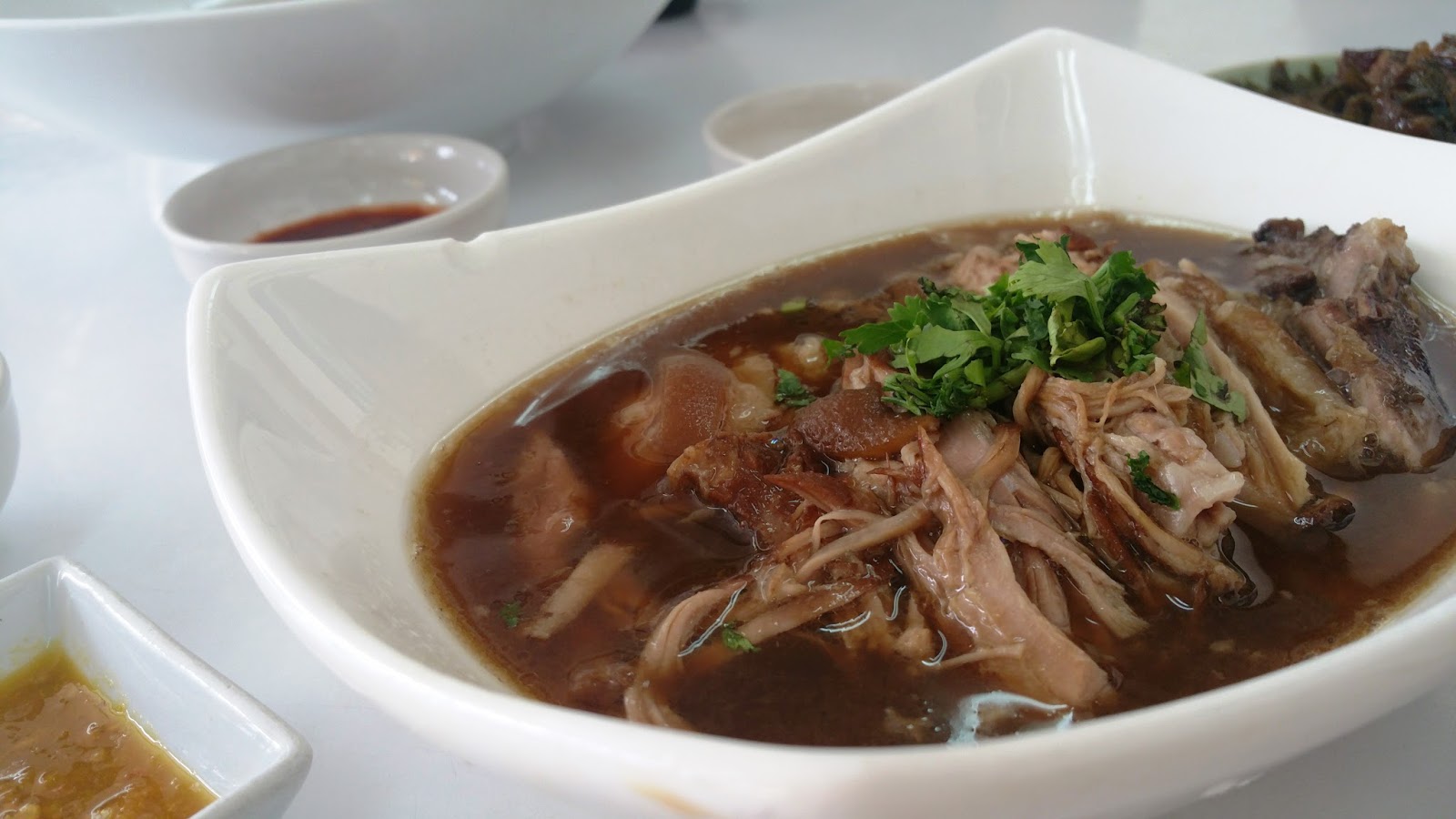 店名叫ก๋วยเตี๋ยวเนื้อ อาปา(音:骨屌乸 阿霸),ก๋วยเตี๋ยวเนื้อ(音:骨屌乸)是牛肉粉的意思。店面就跟泰國普通的平民食堂差不多,但不一樣的是... 裡面竟然有冷氣間!店家的招牌菜 - 清湯牛坑腩,看起來份量少,因為盤子很大,其實份量算適中。