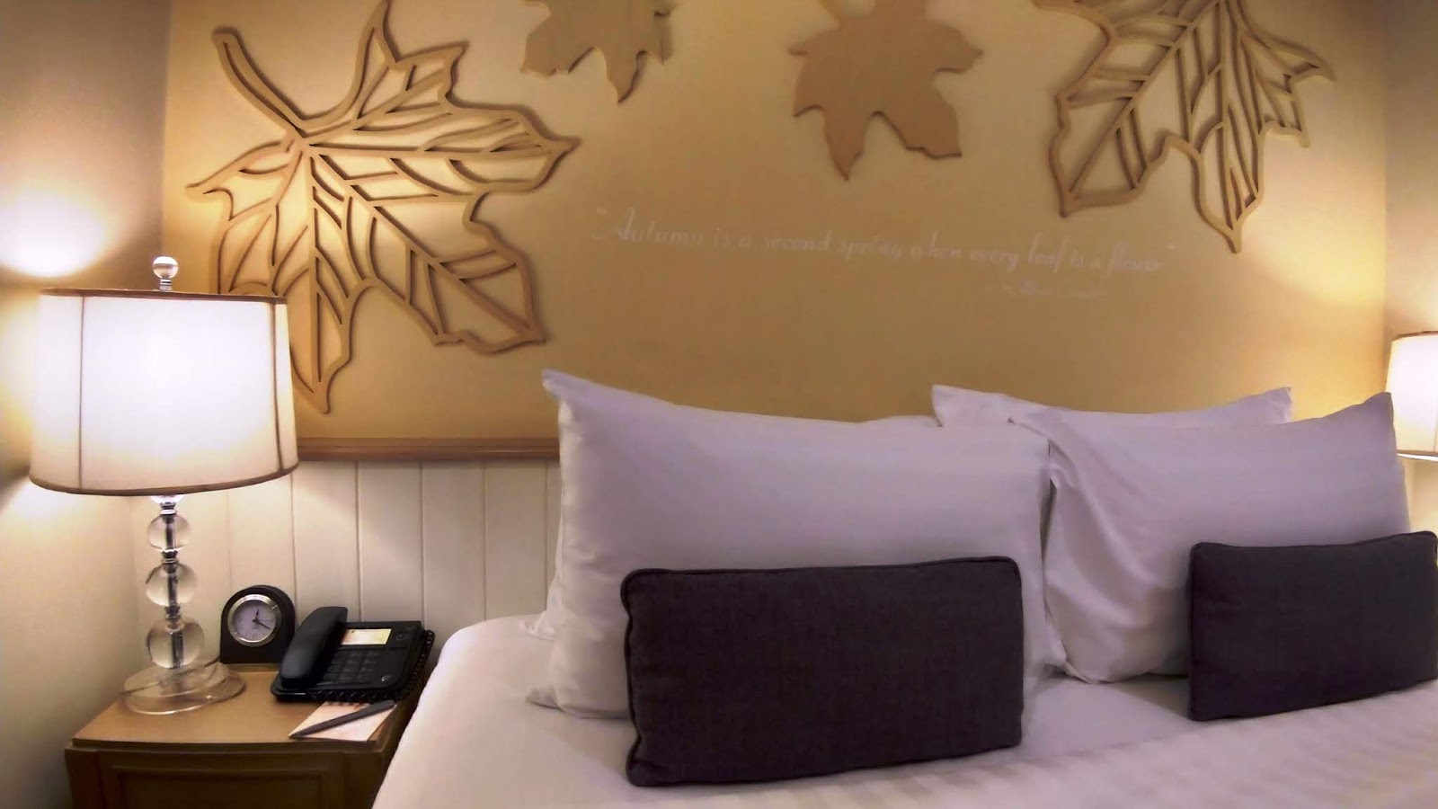 床是 queen size,不夠玩花式滾床單,不過床褥跟枕頭都軟硬度適中,蠻好睡。另外據說飯店以春夏秋冬作為房間主題,這個有楓葉的應該是秋天... 吧? 官網上看到 Deluxe 房型的有雪花圖案。
