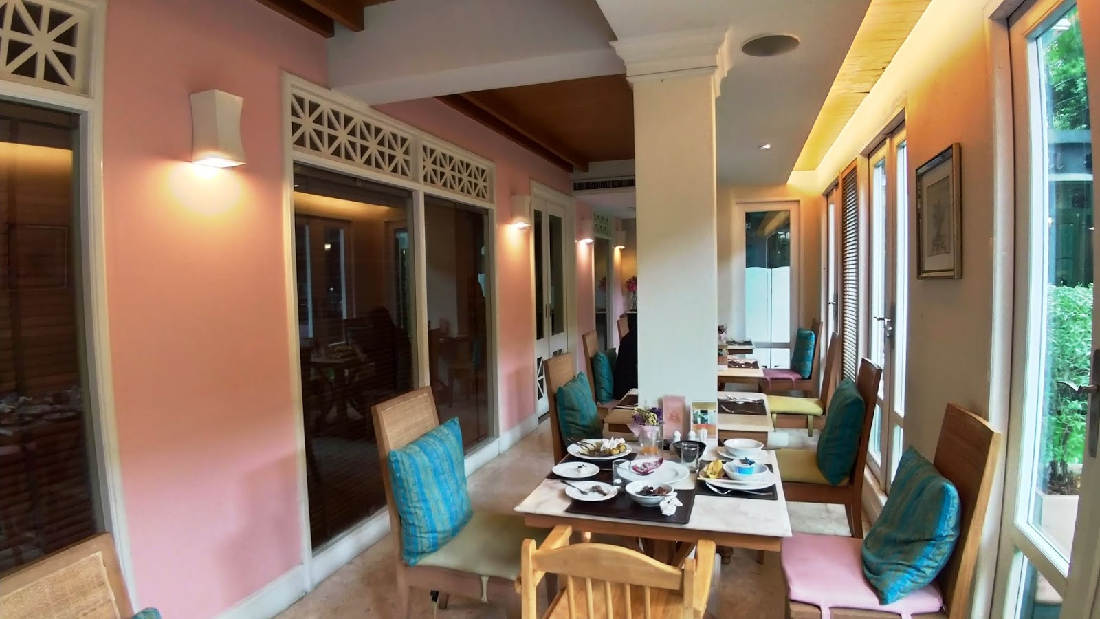 吃早餐的餐廳在側樓,戶外用餐區加上五顏六色的外牆很有殖民地色彩