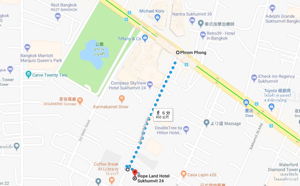 這次寫的 Hope Land Hotel Sukhumvit 24,位於Sukhumvit soi 24,從曼谷新或是舊機場坐的士過去,不塞車的話一樣30分鐘就會到... 而從BTS Phorm Phong站下來走路大概直走6分鐘就會到,位置非常便利。