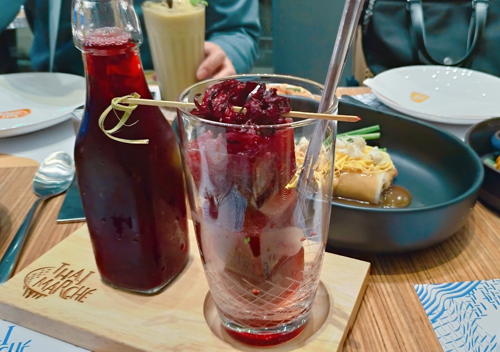 Iced Roselle 洛神花冰茶 (95泰銖)以洛神花茶做的冰塊,配以預先冰過的洛神花茶,冰塊溶解後也不會影響味道。