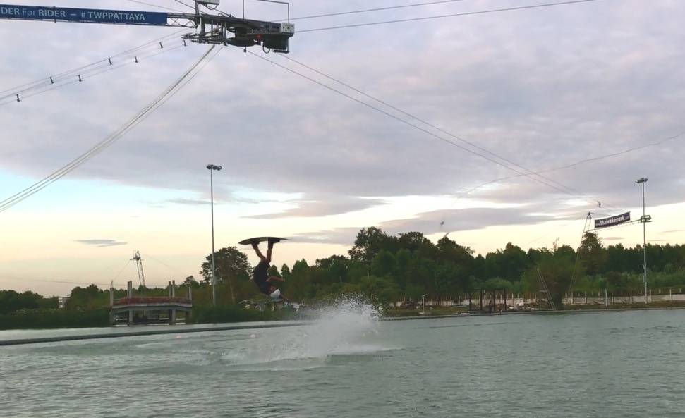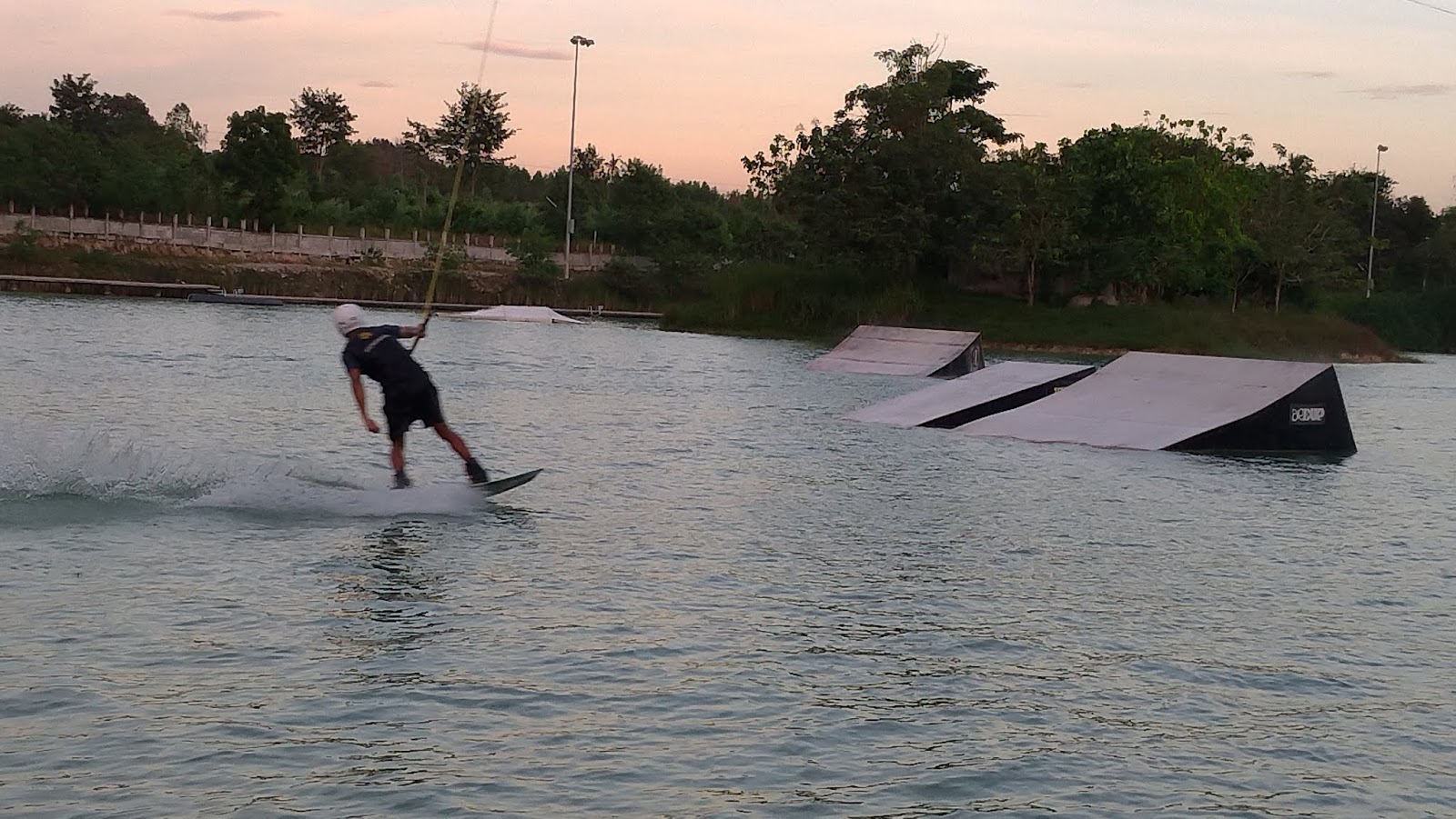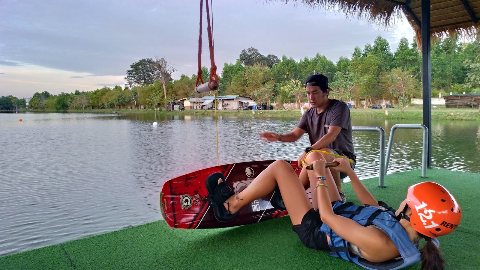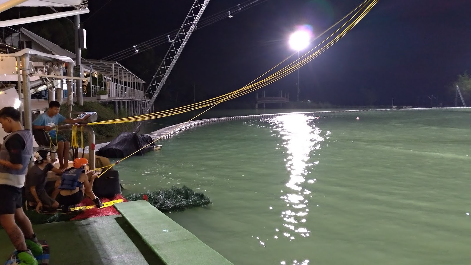 怎麼說不用租船?因為 Thai Wake Park 玩的是 Cable Wakebboarding (鋼索滑水) ,不用等船開動,不用等前面的玩完慢慢爬回船上,只要等把手自動飛過來,抓住,滑出去就好~