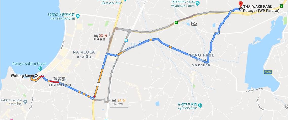 Thai Wake park距離芭堤雅市中心不遠,最方便的交通方式是開車或是搭 Grab Taxi,一般半小時內回到,不塞車的話更是不到20分鐘可達呢!
