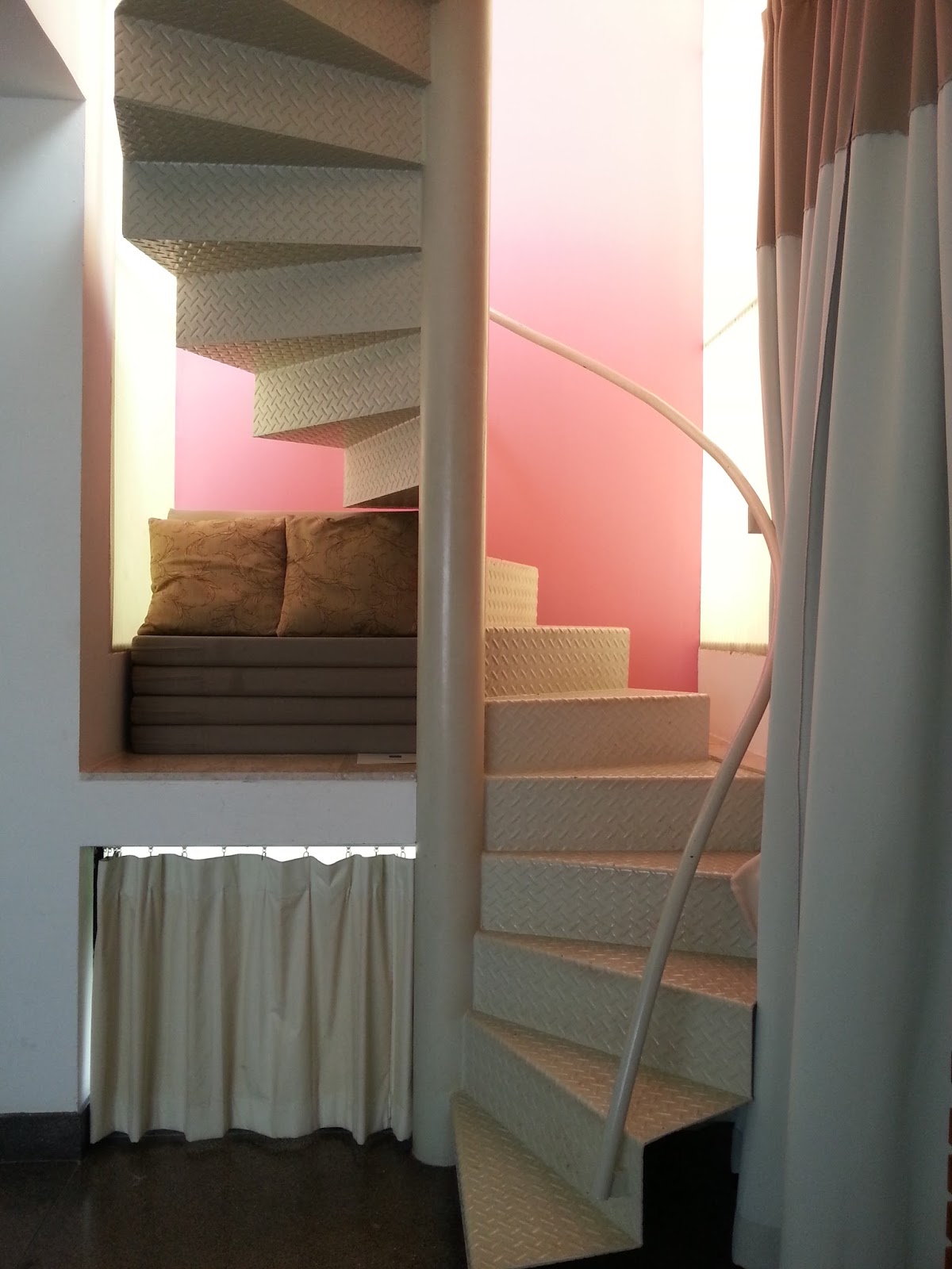 房間一角是通往天台的宣傳型樓梯,樓梯下有軟墊可供客人拿到天台躺