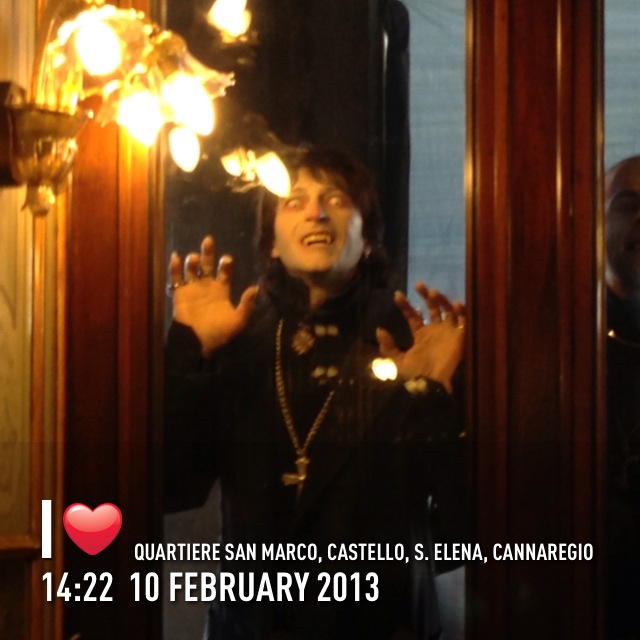 我們步出酒店走至一條無名小橋,迎面而來兩女一男的面具人及隨行2至3個攝影師,來了幾天沒遇上他們,但擦身而過後有一份熟悉感......在我們想著是否之前識的人的同時(雖然面具和衫都不見過,但就是有一下的直覺),男面具人追回來簡單英語說你們是XXXXX及XXXX嗎? 弟即時就想起原來比利時M先生~!