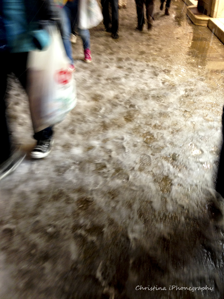 我的鞋子的鞋頭濕到變成深色,相機一直在袋休息,掙著雨傘盡量行在有蓋的地方,可是有風吹,而且其他人的鞋子都沾上雪再走在有蓋的地方,滿地水之外,灰黑色的!!