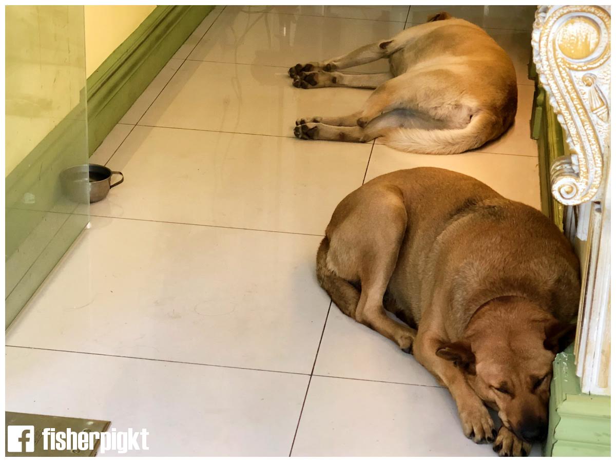 店內有兩隻狗在懶洋洋地睡覺,後來它們醒來,並在店外漫步
