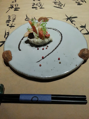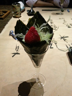 看似簡單的菜色,但廚師突然出現,即場製作手卷,在我們面前把紫菜烤熱後把米飯跟草莓包起來,草莓非常鮮甜,而且用的不是一般的壽司飯,是炸過的米飯,咬下酥脆,本來很簡單的菜色但經過改良後加點創意也可變成特別的一道菜。