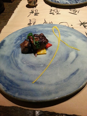 一坐下服務員就為我們介紹當晚的菜單,原來菜單一早已經寫在桌上! 但實質吃甚麼還是不清楚,一共有十道菜,分別是珍味、刺身、酒、烤物、有機醋、蒸物、特品、食事、碗盛、甜品。安排都挺細心,介紹完後服務員會問有沒有人不吃牛或生魚片,會不會對海鮮敏感等。如果不吃牛肉的話會把它改成雞肉,至於生魚片會變成熟食。聽完介紹後好興奮,因為沒有預設菜單,所以對每一道菜都好期待。每道菜上時服務員會再介紹。