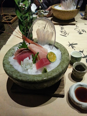 擺盤很漂亮! 石盤上放着生魚片,一共有五款生魚片跟大蝦,因為宜蘭沿海,所以有很多新鮮海產,而我們吃到的生魚片全是本地供應,再搭配醬油跟果醋兩種醬汁。在透明毋罩上的魚切得很薄,薄到透光,魷魚有紫蘇葉的味道。雖然新鮮但肉質比起日本的生魚片還差一點,有點帶筋。
