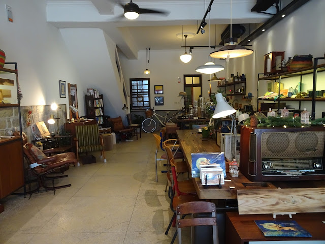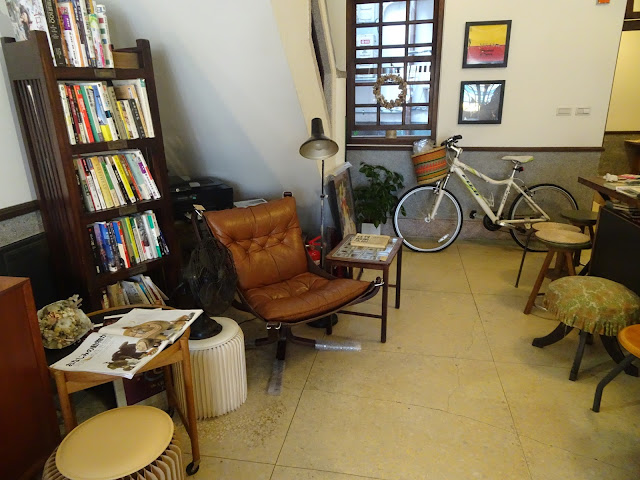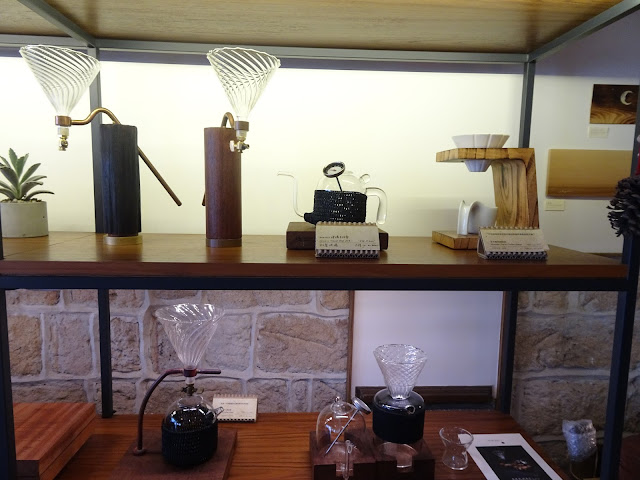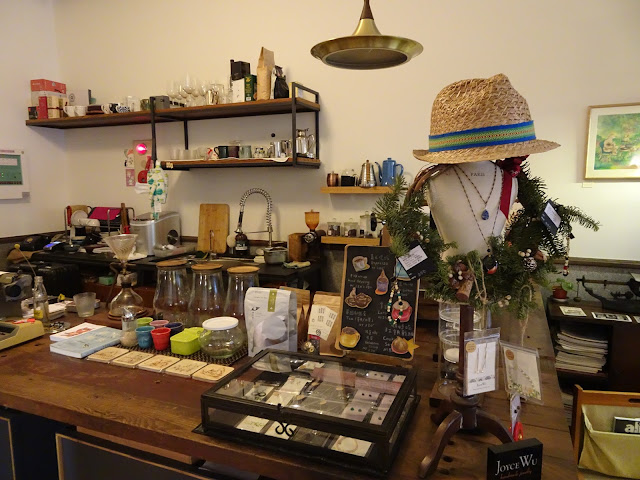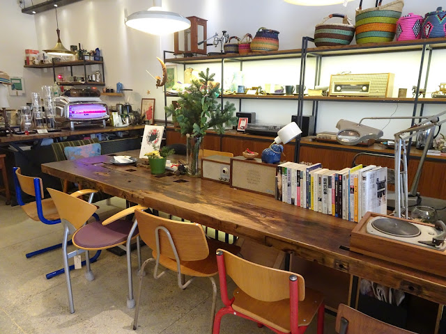 咖啡店的門口由六塊木門而成,未進入室內已隱約感覺到一種古典氛圍。打開門立即進入另一個時空,咖啡店放滿老闆們由世界各地搜集回來的傢俱與小東西,大多是有相當歷史的老物件,像古董打字機、19世紀初的德國郵局天秤、50年代的京都地圖、60年代的黑膠唱片,設計很具心思。