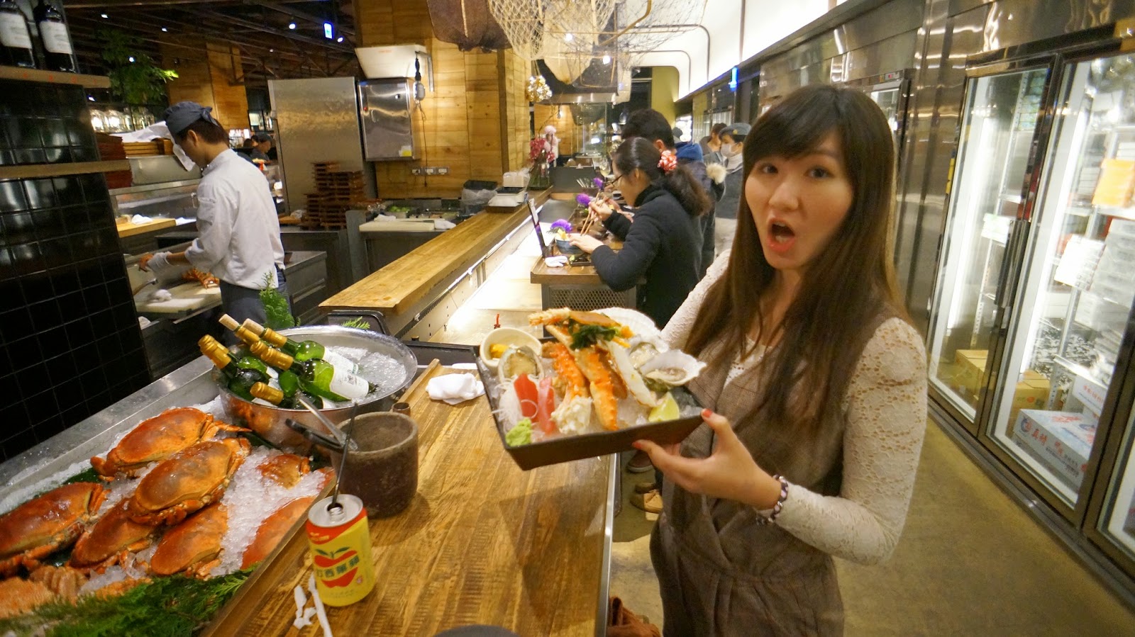 入到去就會見到人頭湧湧。上引水產分左幾部份,中間係外賣區,格局極像一田超市的壽司部,所有食物一盒盒pack好曬俾大家揀。有壽司、刺身、生蠔、長腳蟹、甜品、生果、酒等等。買完可以出去頭先個幾張高枱食,唔係就可能要拎返去酒店食。由於呢部份太像一田,不太有吸引力,而且我目標也不是來買外賣,所以我冇試過,唔知好唔好食。(但友人說其實質素挺高,價格也不貴,不是一田那種情況啦)