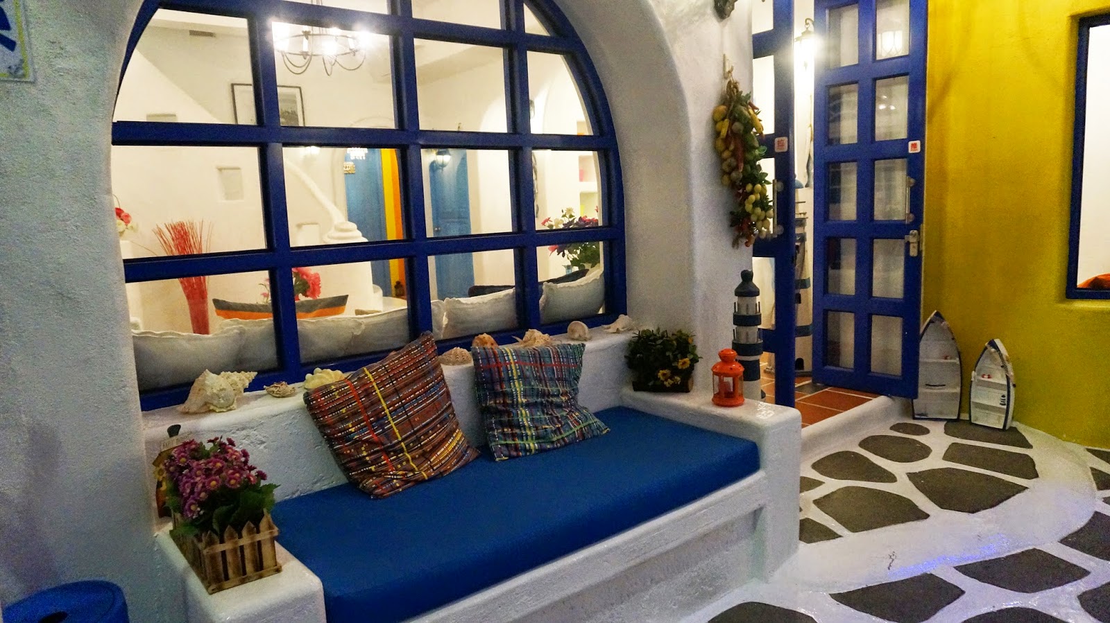 裡面的設計也是超級希臘風,走到連接一館和二館的中庭,就真的很有去了聖托里尼的感覺!!拱形的玻璃窗、地板、梳化、燈、假花,全部都好靚。一館和二館的底層都是大廳的設計,一館大廳是check in counter。而二館的底層大廳設計很精緻,有很多小擺設和裝飾,營造了很溫馨和諧的感覺,非常有心思。夜晚坐在這裡傾偈好舒服,是整個民宿我最喜歡的部份。