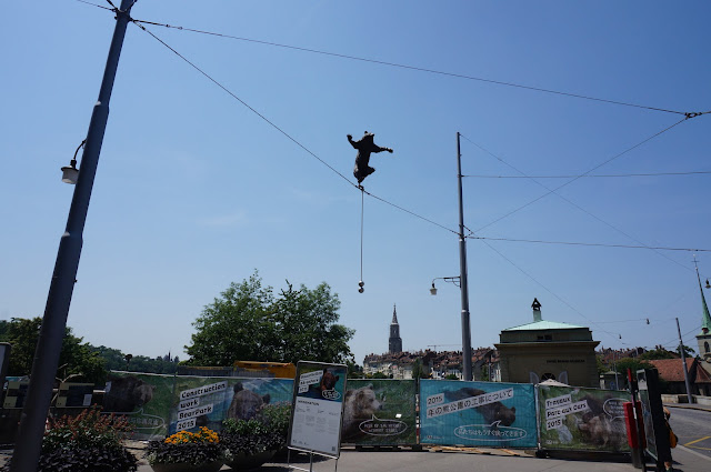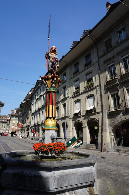 從蘇黎世去伯恩約一小時火車,伯恩比較像歐洲典型的城市,那些建築物充滿古典味的城鎮。因為喜歡舊城的關係,我個人是蠻喜歡伯恩的,也是世界文化遺產啊。從火車站出來一直沿大路行就可以,主要景點都很集中,不用搭車。伯恩有很多噴泉,每個都是不同的造型,都有相當的歷史,每個我都會看一下是什麼來的。其中有個是食童噴泉,一個在吃小孩的人......一種要警告小孩們要乖不然就會被吃掉的概念。一直走會看到一個很美的鐘塔,從1218年就已經開始運作!每小時的56分,時鐘上就裝飾就會動,歐洲的鐘好像都喜歡這種設計......很像布拉格的天文鐘。想從高空看舊城全景就要登上伯恩大教堂,是瑞士最高的教堂,一覽無遺的舊城好美,全是橙紅色屋頂,還有河水是綠色的阿勒河,好多人直接從橋邊跳下去游水,也太爽了吧!最後是關於伯恩的名字由來,其實是「熊」的意思,所以大街走到盡頭有個熊公園,有真的熊,但我去的時候並沒有看到,好像是公園的休息時間......遠一點的山頭還有個玫瑰公園,風景好像很不錯,這次沒有去。