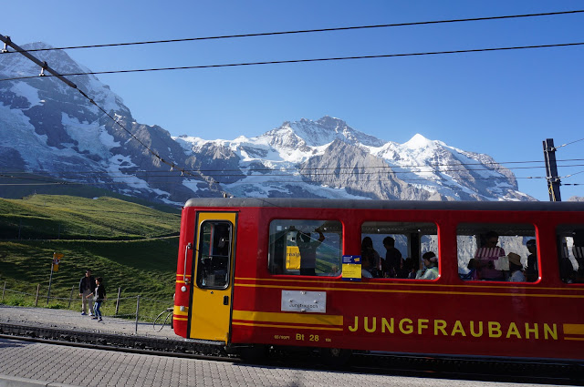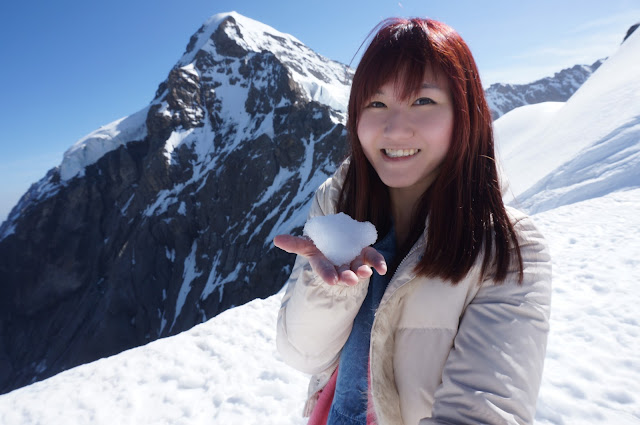 這應該是大家最期待的瑞士景點吧,少女要上少女峰了!4158米高的少女峰是阿爾卑斯山群中最具名氣的山峰,在少女峰上的火車站也是歐洲最高的,3453米。從Grindelwald搭火車在Kleine Scheidegg轉車,就可以上少女峰,中間會經過Eigerwand和Eismmeer,兩個站都會停幾分鐘,可以下車在室內的環境看看窗外的雪山景色,讓大家適應一下山的高度。鐵路花了16年建造,在雪山裡起鐵路真的太不可思議了!下了車後去到觀景台之前有條看冰雕的隧道,還有些展覽什麼的,之後就可以走出室外,真的真的腳踏少女峰,眼前景色全是白茫茫的,好震撼!(我已經沒有多餘的形容詞想寫了,哈)我夏天去,山上體感溫度大約有一度左右,因為有陽光,感覺不太冷。