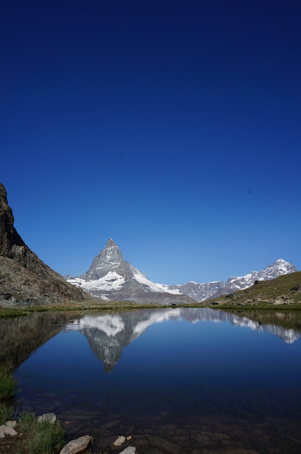 大約行10分鐘,就來到Riffelsee湖。這個是必定要去的,因為可以看到馬特洪峰的倒影在平靜湖面上,非常清楚,太美了!又要感謝天氣再加感謝自己願意早起,又是一個全無遮擋的馬特洪峰啊!一點雲都沒有,太幸福了。瑞士很多登山列車都有個特色,就是大家可以隨意挑一個站下車,之後就健行,上山或下山也可以,走到下一個站再決定想繼續行還是搭車,沿途指示都很清晰,不會迷路,盡情享受風景就好。