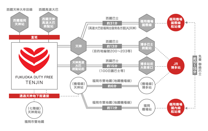 本免稅店位於天神福岡三越內。天神是福岡備受歡迎的旅遊區,旅客在購物和觀光旅遊時,可以輕鬆到這裡購物。