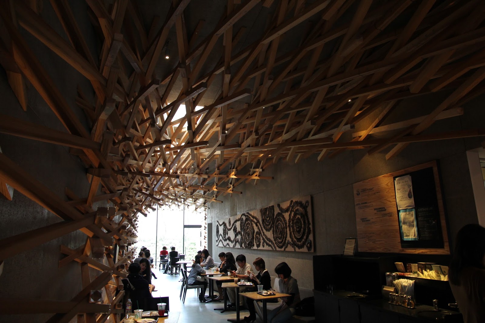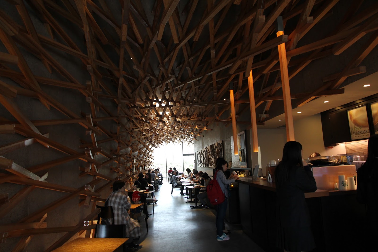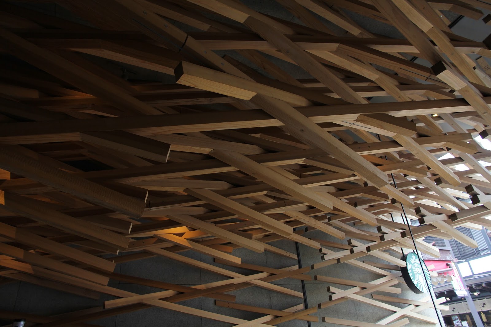 來此,欣賞大師的設計才是重點,木方層層疊疊的交錯於天花