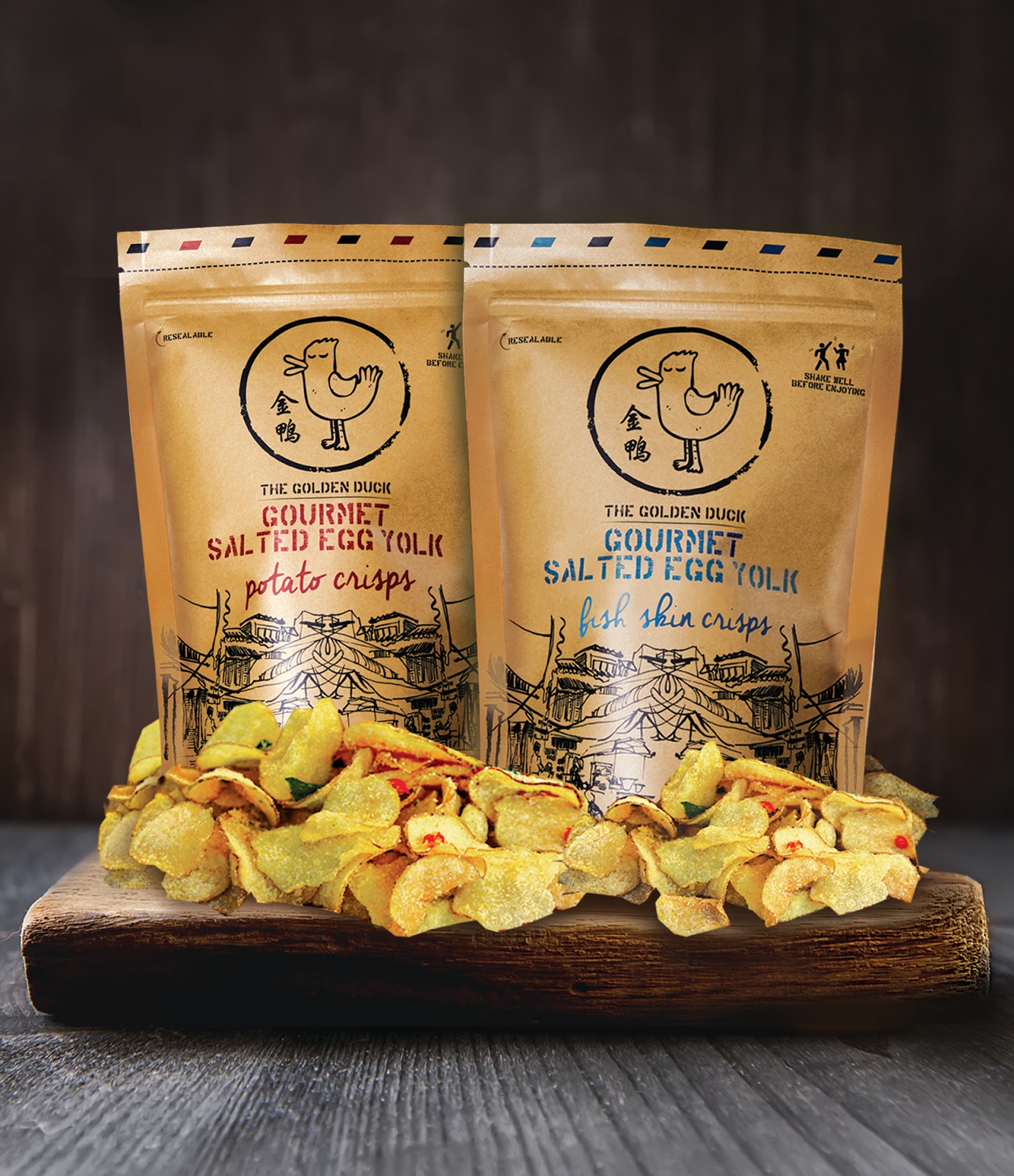 五星級食譜 新加坡手工零食品牌金鴨的團隊跟一眾好食之徒一樣熱愛零食,是故品牌一直致力研發嶄新破格滋味,務求創造出讓人難以抗拒的風味零食。品牌團隊從經典中菜的餐桌上尋找靈感,其中鹹蛋就是中式菜餚其中一樣最常見且令人垂涎的食材;而炸魚皮更是我們食粥、打邊爐不可或缺的必點小吃;團隊遂發揮創意,把香濃惹味的鹹蛋黃與香脆的炸魚皮及薯片結合,炮製出風靡全城,鹹中帶甜並有陣陣香草味道的邪惡滋味。