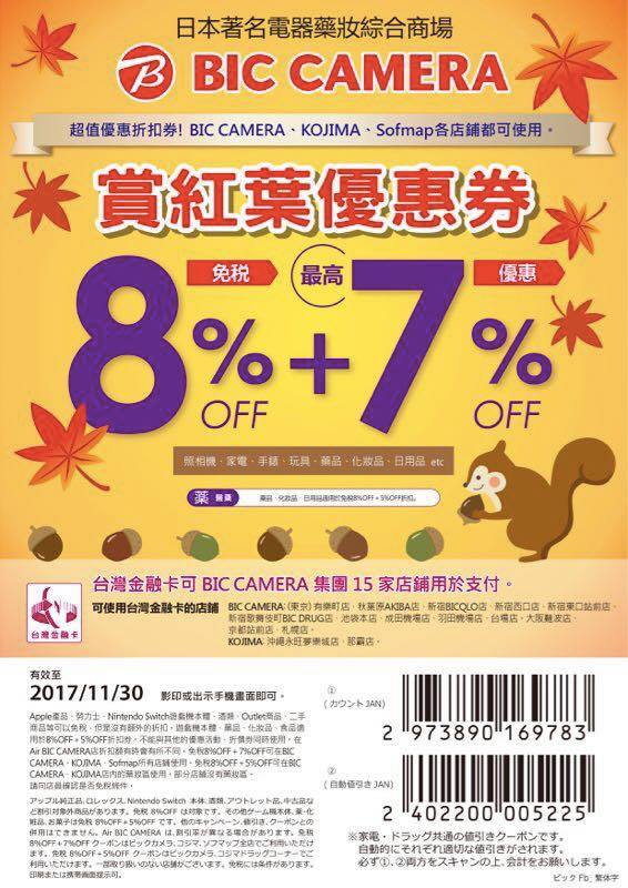 8%免稅+7%折扣的BIC CAMERA電器優惠券