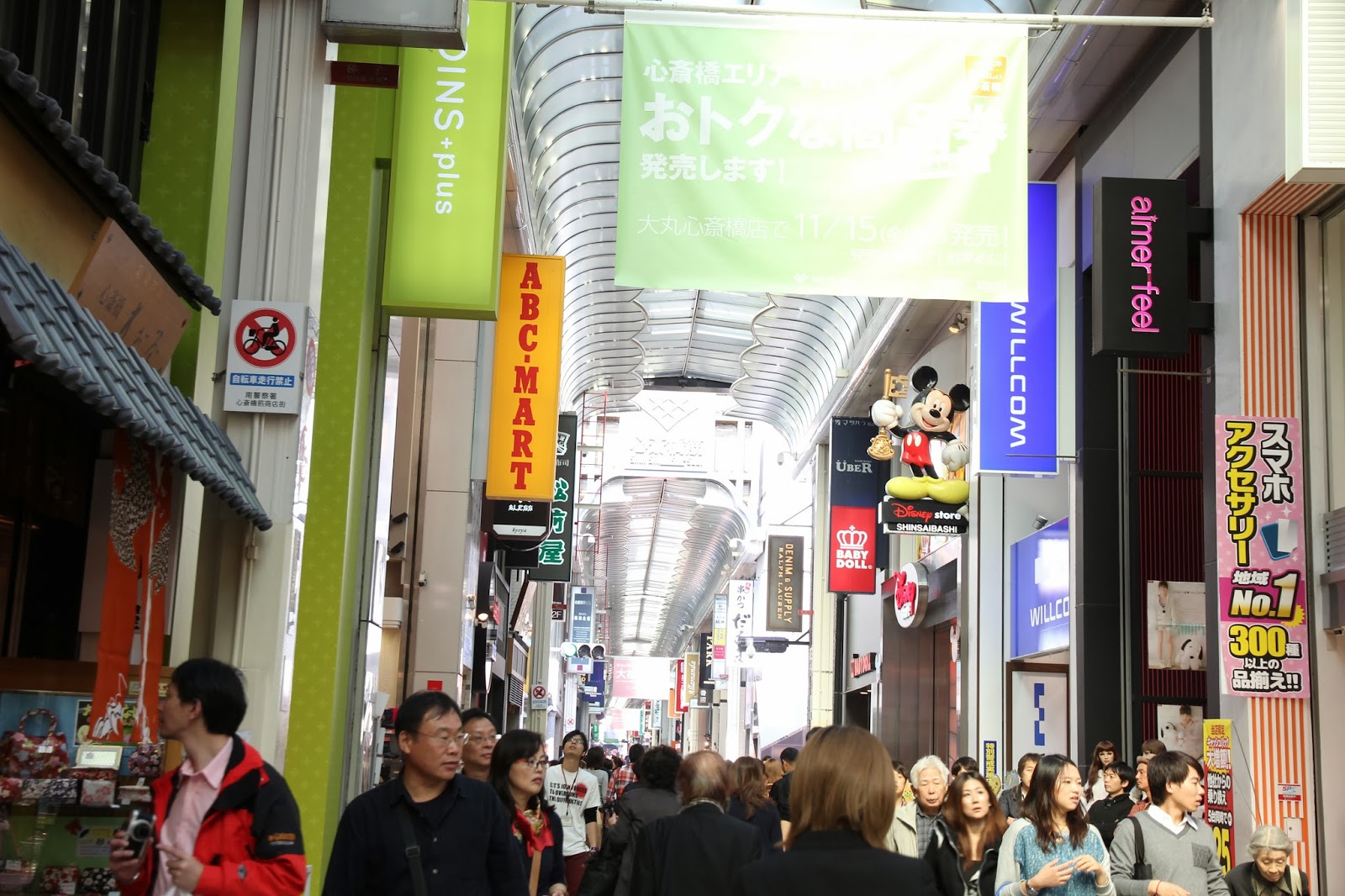 概要在御堂筋大街東面與之平行的心齋橋筋商店街是大阪最知名的購物區,也是大阪的一個永久性標誌。遠在江戶時期,這裏就已形成了購物商圈,距今已有380年的歷史。直到今天,這裏依然是熱鬧非凡,各個年齡層次的人們都會光顧這兒。在長達600米的擁有拱形天棚的商店街裏,和服店、西式服裝及鞋類的零售商、珠寶店、時尚服飾店以及各種餐飲店一字排開,很多人喜歡在這裏邊欣賞各式櫥窗商品邊渡過自己的閒暇時光。