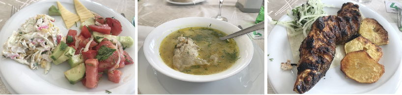 在湖畔享用豐盛的午餐,雖然是要自費的,但絕對值得,有著大大塊雞肉的雞湯、主菜是燒魚,賣相一般,卻超好吃,是塞凡湖的特產 . . .