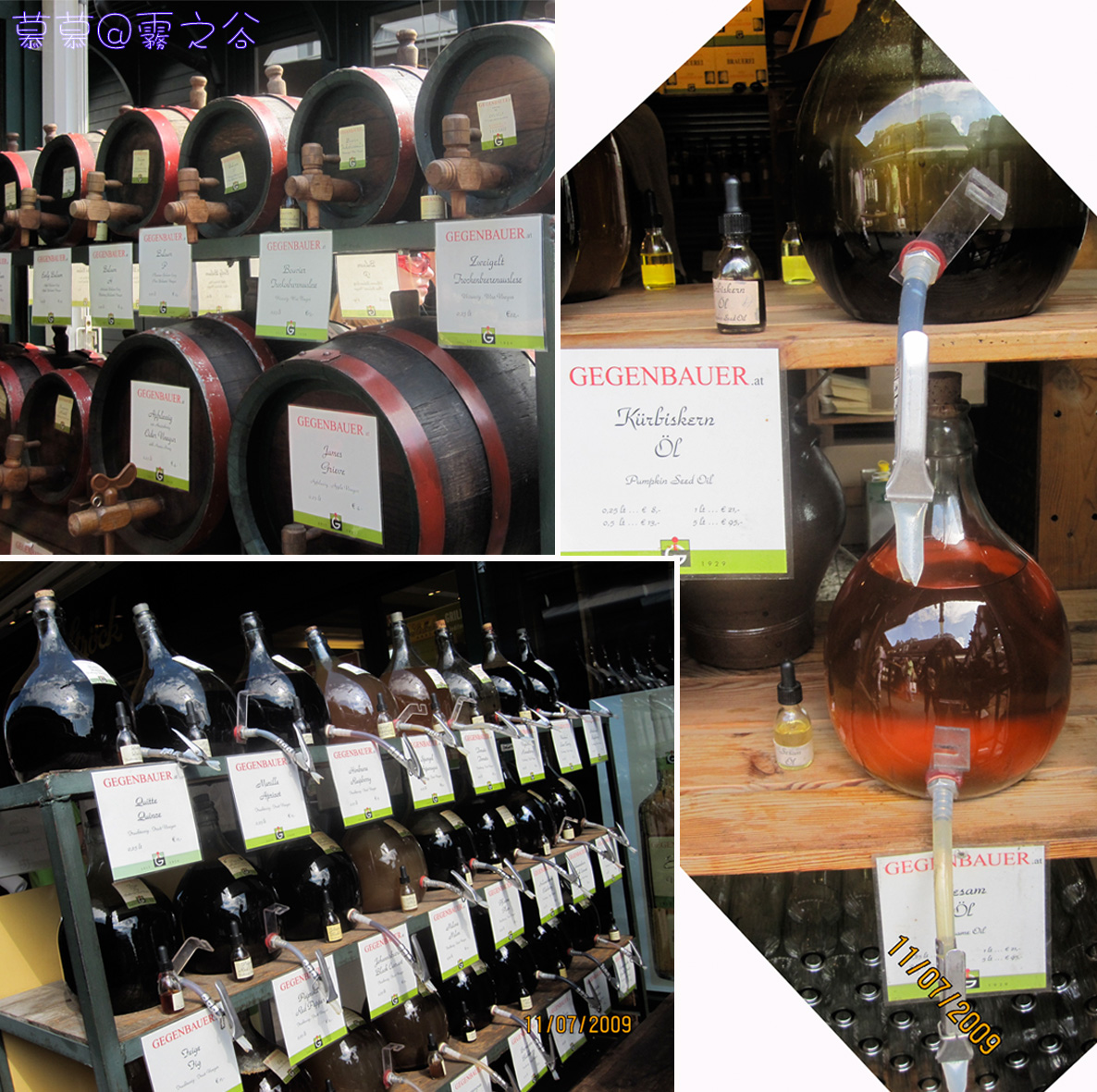 各式各樣的食品、香料、芝士、差不多有人頭般大的辣椒. . . ,還有一桶桶的醋和一缸缸的南瓜籽油,隨便逛個半天,也是非常有趣,結果慕慕也花了一歐元買了一套兩件的玻璃油瓶和醋瓶,雖然未必真會拿來用,但也是給自己的一件不錯的紀念品。