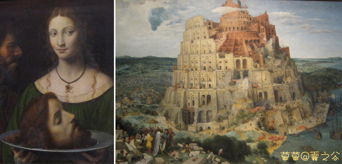兩張取材自聖經的畫作:捧著施洗約翰頭臚的莎樂美 "Salome with the head of John Baptist" by Bernardino Luini ;以為人可以超越上帝的巴別塔 "Tower of Babel" by Pieter Brueghel。