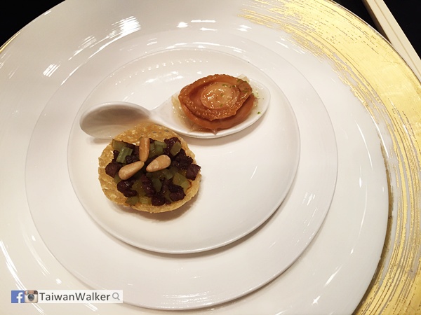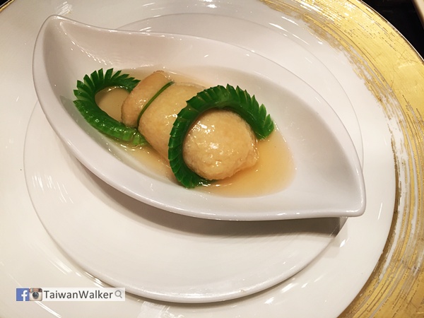 前菜是崧子粒粒/ 柚子果凍配鮑魚。鮑魚的鮮配柚子果凍味道實在配搭得宜,很好吃。