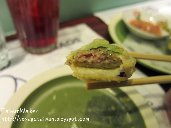 包著茄子, 豬肉跟紫蘇葉. 不過味道就可以再更好一點, 豬肉的肉香蠻淡的