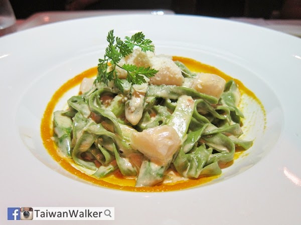 帶子菠菜意大利麵配野生蘆筍及南瓜醬汁