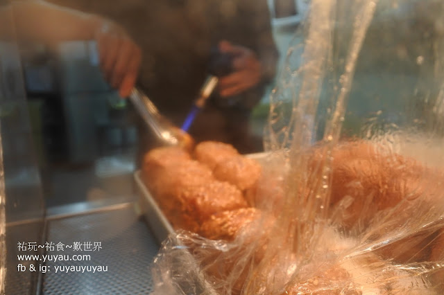 下單後店員就會用火槍炙燒其表面,再用紙包好就將肉卷飯團連膠袋遞給我。