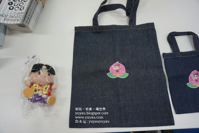 四個印章可以換取桃太郎圖案牛仔大手提袋(右),而蓋了五個印章的話可以換到桃太郎公仔(左)