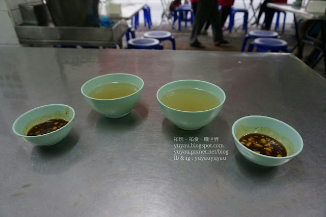 先送來剛才提到用上雞骨熬成的湯及辣椒蒜沾醬,湯頭滿滿雞香,味道鹹香帶著頗重胡椒味,若喜歡的話可以單點一大碗來喝 (會付上小許雞背及內臟)。