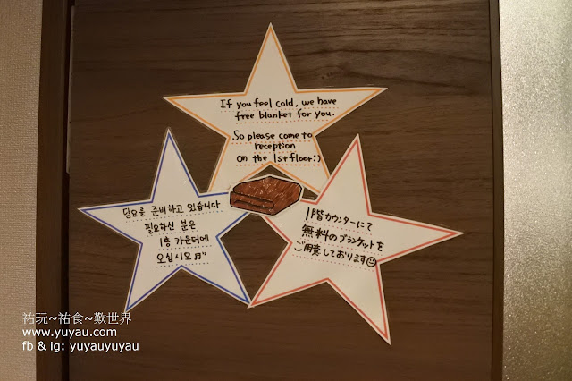 若怕冷的話可以到前台借毛毯,是免費的喔!