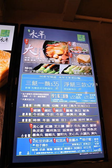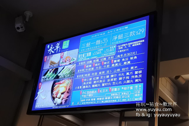 餐牌好簡單,三餸(配料)麵 HK$35(現已加價到$36),淨餸 HK$29。配料就在下方所列的選三種。每多加一個配料多付$8或9。