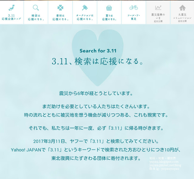 一如往年,今年日本Yahoo繼續推出"Search for 3.11"活動,只要在日本時間3月11日當日於日本Yahoo上搜尋"3.11",日本Yahoo就會捐出10Yen幫助災民作復興之用。